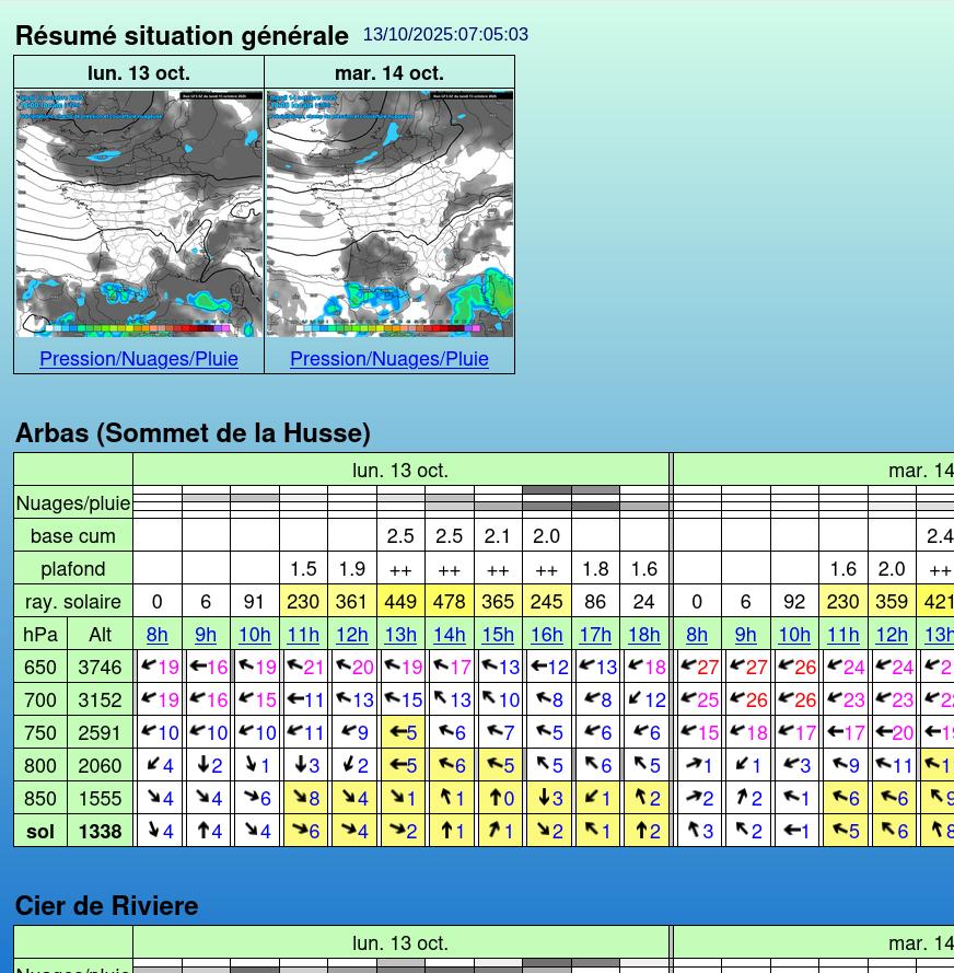 Pour les prévisions, un tableau issu de Paraglidable indique les possibilités de vol pour chaque site pour les prochains jours. Une page prévisions par site rassemble pour chaque site les météogrammes de Meteoblue, des comparaisons de modèles et des analyses des conditions futures par Meteo-Parapente et Velivole.